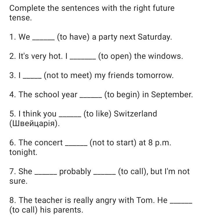 Complete the sentences with the right future tense. 1. We _________ (to have) a party next Saturday. 2. It's very hot. I (to open) the windows. 3. I (not to meet) my friends tomorrow. 4. The school year. (to begin) in September. (to like) Switzerland 5. I think you (Швейцарія). 6. The concert tonight. (not to start) at 8 p.m. 7. She _______ probably _____ (to call), but I'm not sure. 8. The teacher is really angry with Tom. He (to call) his parents.
