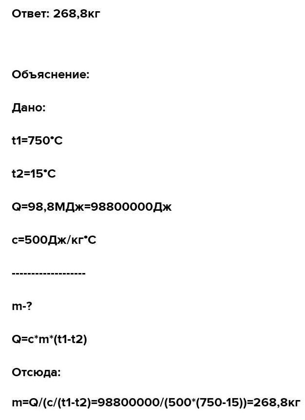 m=Q/(c/(t1-t2)=98800000/(500*(750-15))=268,8кг