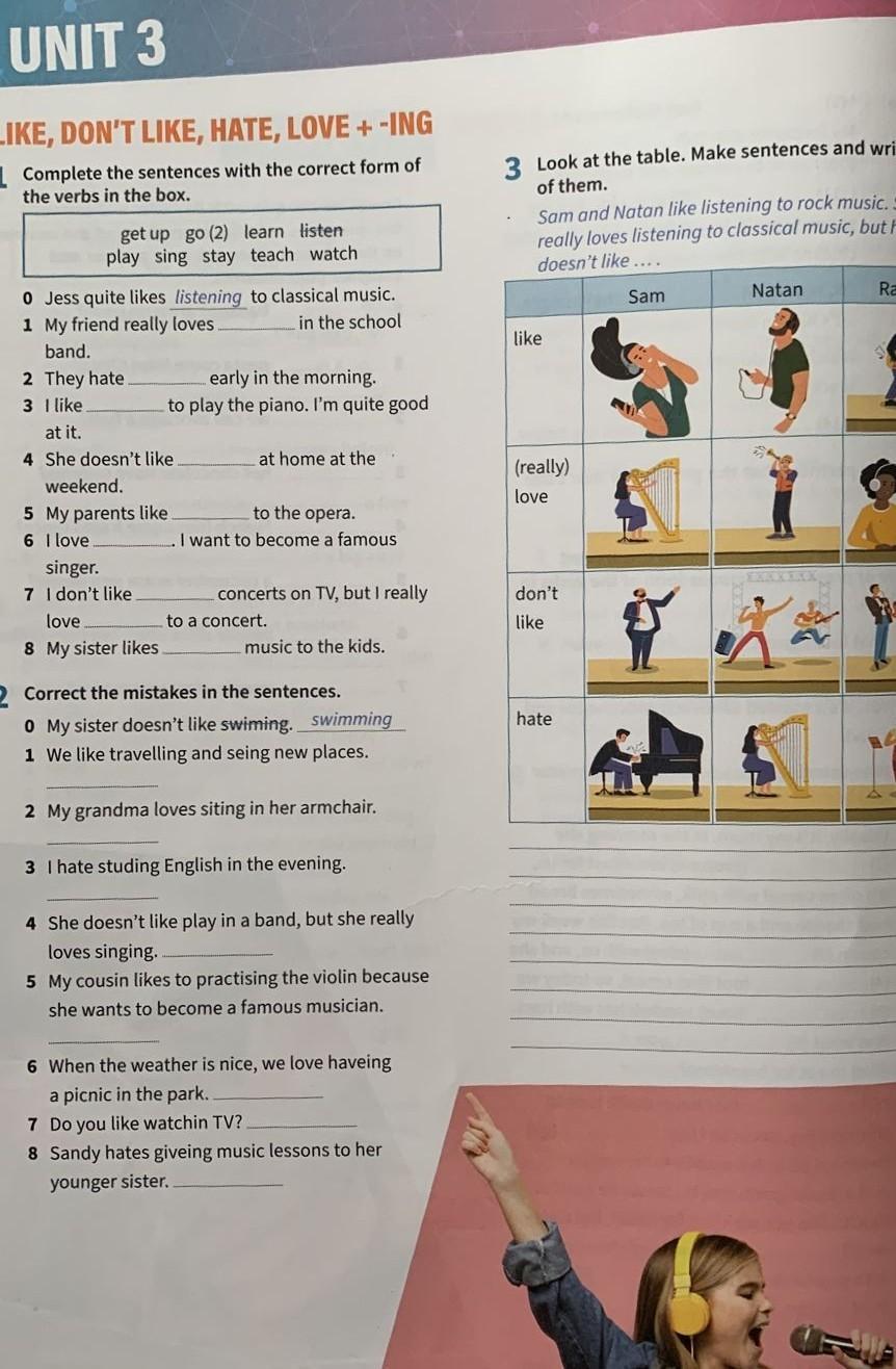 LIKE, DON'T LIKE, HATE, LOVE + -ING Complete the sentences with the correct form of the verbs in the box. get up go (2) learn listen play sing stay teach watch 0 Jess quite likes listening to classical music. 1 My friend really loves in the school band. 2 They hate. 3 I like. at it. 4 She doesn't like weekend. 5 My parents like 6 I love singer. 7 I don't like early in the morning. to play the piano. I'm quite good love 8 My sister likes. at home at the to the opera. . I want to become a famous concerts on TV, but I really to a concert. music to the kids. O Correct the mistakes in the sentences. 0 My sister doesn't like swiming. swimming 1 We like travelling and seing new places. 2 My grandma loves siting in her armchair. 3 I hate studing English in the evening. 4 She doesn't like play in a band, but she really loves singing. 5 My cousin likes to practising the violin because she wants to become a famous musician. 6 When the weather is nice, we love haveing a picnic in the park.. 7 Do you like watchin TV? 8 Sandy hates giveing music lessons to her younger sister. Look at the table. Make sente of them. Sam and Natan like listening to really loves listening to classica doesn't like.... Sam like (really) love don't like hate Nata