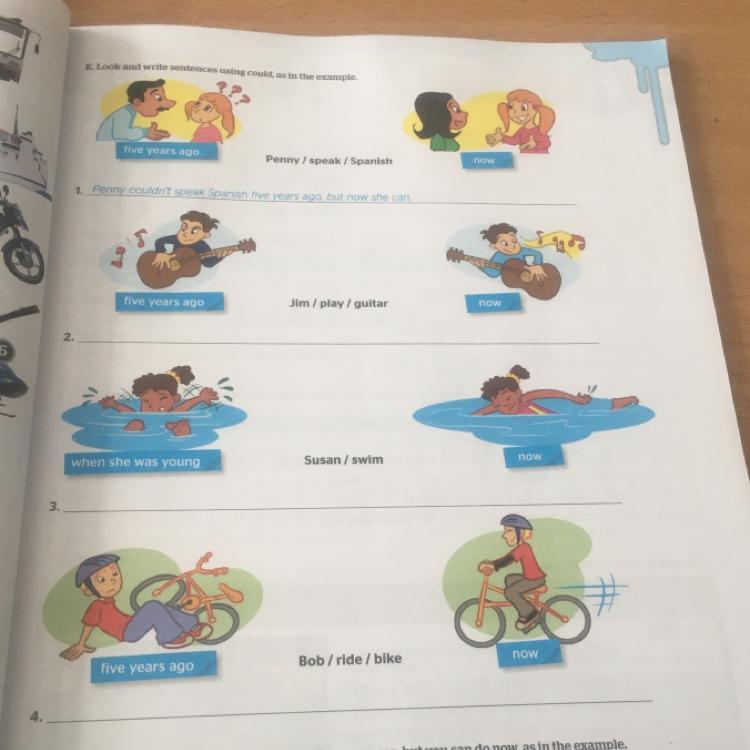 2. Jim couldn’t play the guitar five years ago, but now he can