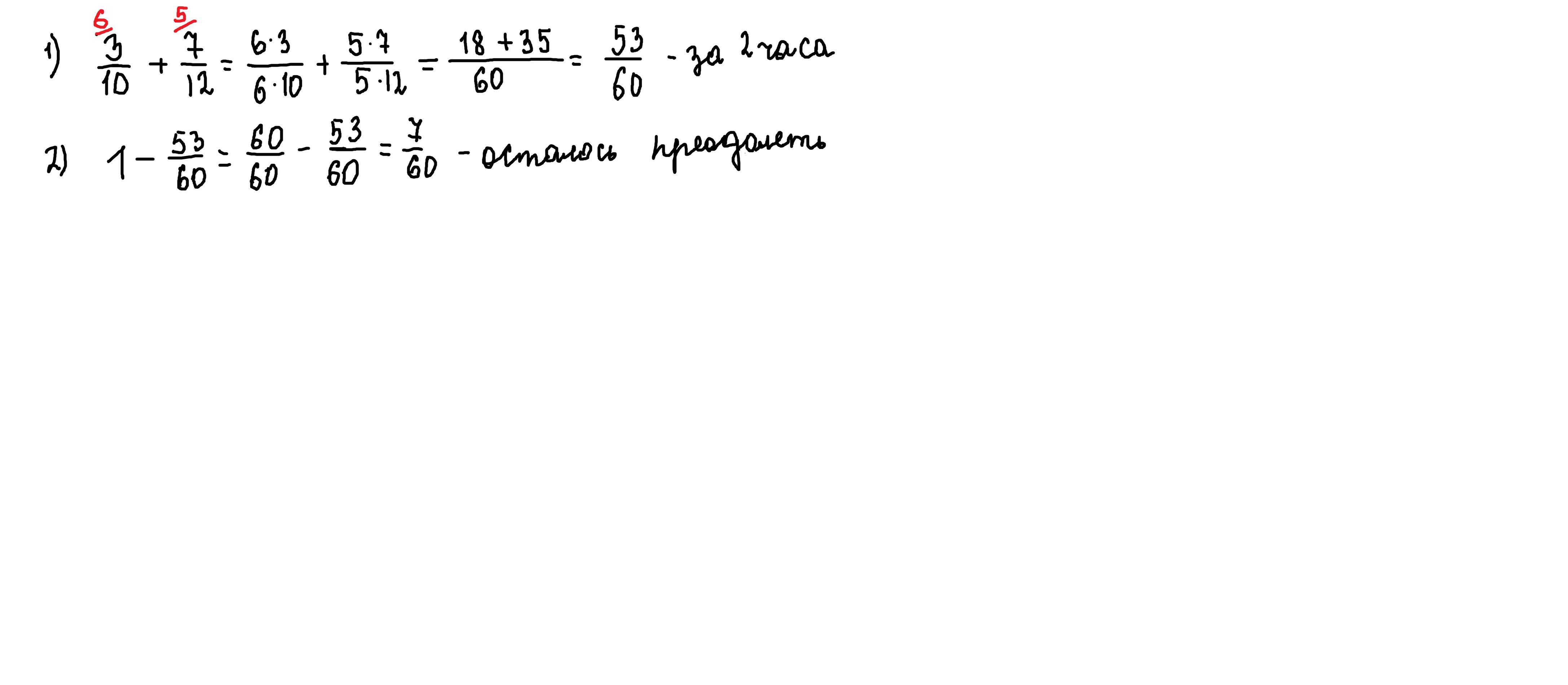 За першу годину турист подолав 3/10 від запланованої відстані, за другу годину - 7/12. Яку частину залишилося подолати туристу?