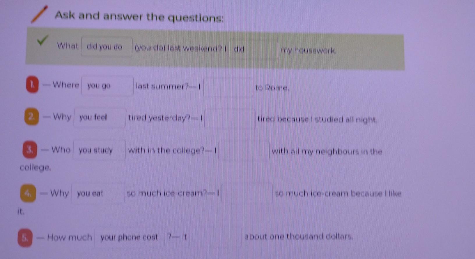 1.- Where you go What did you do 2 - Why you feel 3. - Who you study college it. - Why you eat - (you do) last weekend? I did last summer?-1 tired yesterday?-1 with in the college?-1 so much ice-cream?-1 How much your phone cost ?- It my housework. to Rome. tired because I studied all night. with all my neighbours in the so much ice-cream because I like about one thousand dollars.