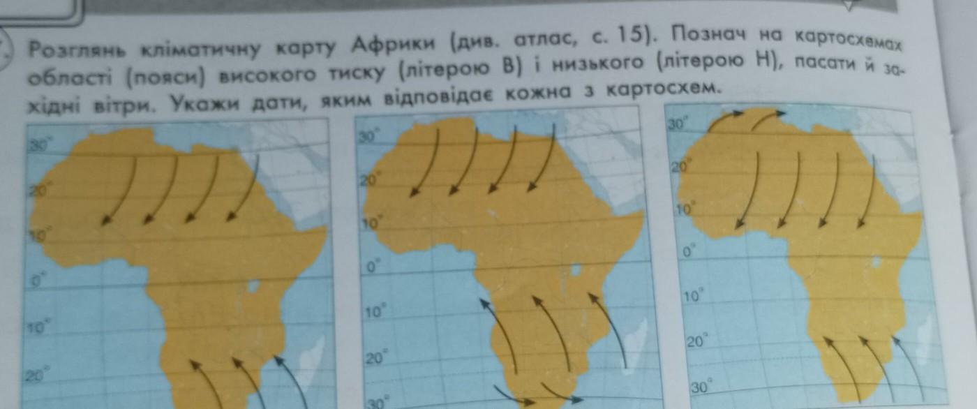 Розглянь кліматичну карту Африки (див. атлас, с. 15). Познач на картосхемах області (пояси) високого тиску (літерою В) і низького (літерою Н), пасати й за хідні вітри. Укажи дати, яким відповідає кожна з картосхем. 30° 30° 30° )))) 20 10° 0° 10° О 20 20 10 0° 10° 0 20 30 !!!! 20 10 10° 20° 30°