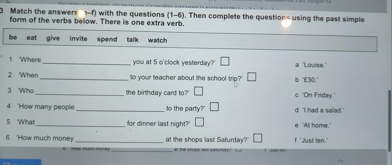Відповідь: 1 —are —e; 2 — talk — c; 3 — give — a; 4 — invite — f; 5 — eat — d; 6 — spend — b.