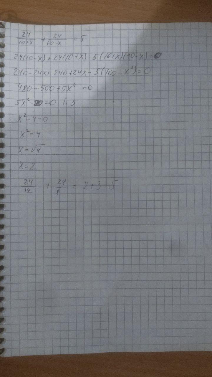 За 5 годин моторний човен пройшов по річці 24 км за течією й повернувся назад. власна швидкість човна 10км/год знайдіть швидкість течії річки. Запишіть математичну модель цієї задачі