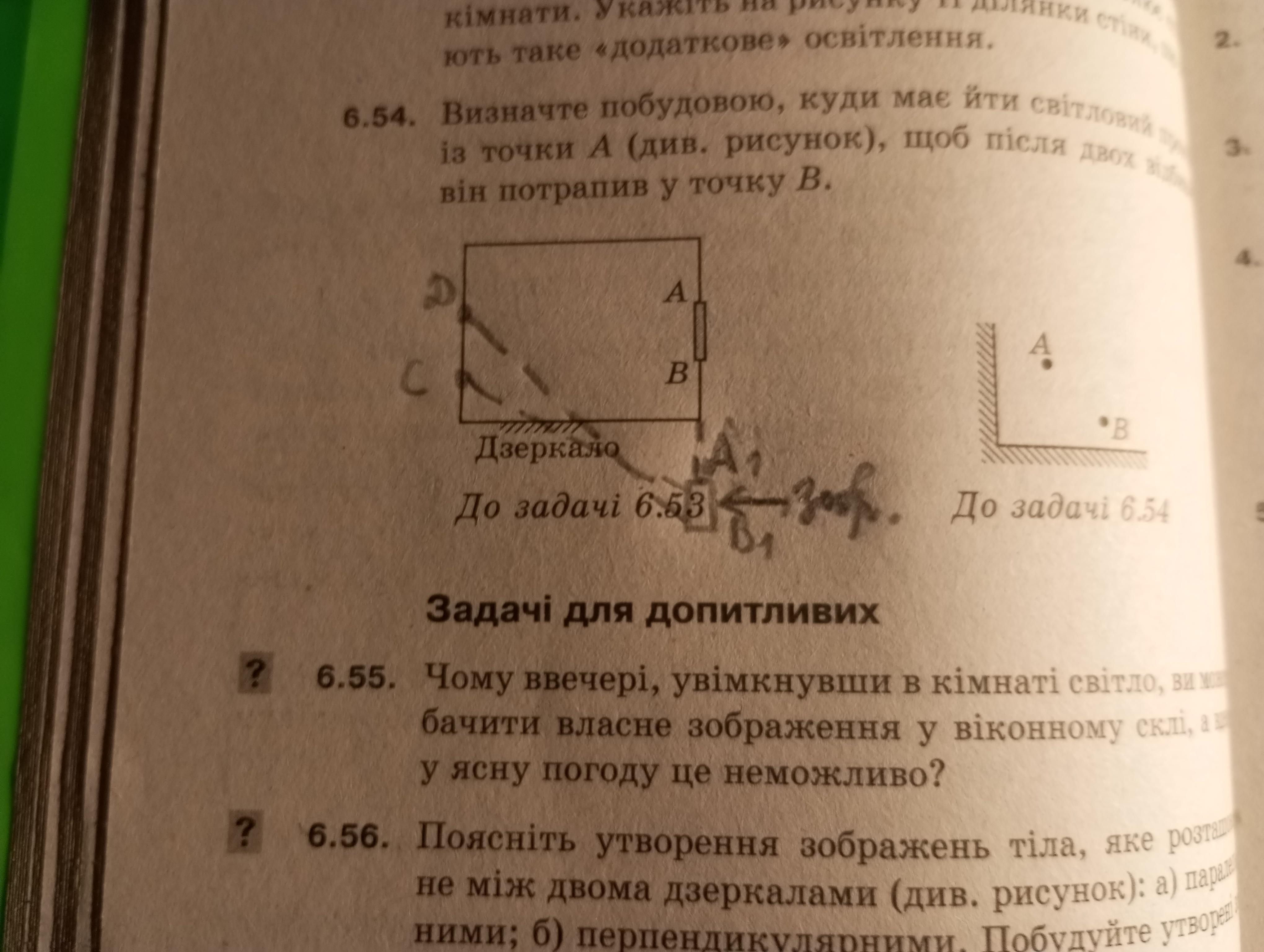 53. Розсіяне сонячне світло потрапляє в кімнату через ві- кно AB й освітлює стіни кімнати (див. рисунок). Світ- ло, що відбилося від дзеркала, також освітлює стіни кімнати. Укажіть на рисунку ті ділянки стіни, що ма- ють таке «додаткове» освітлення.