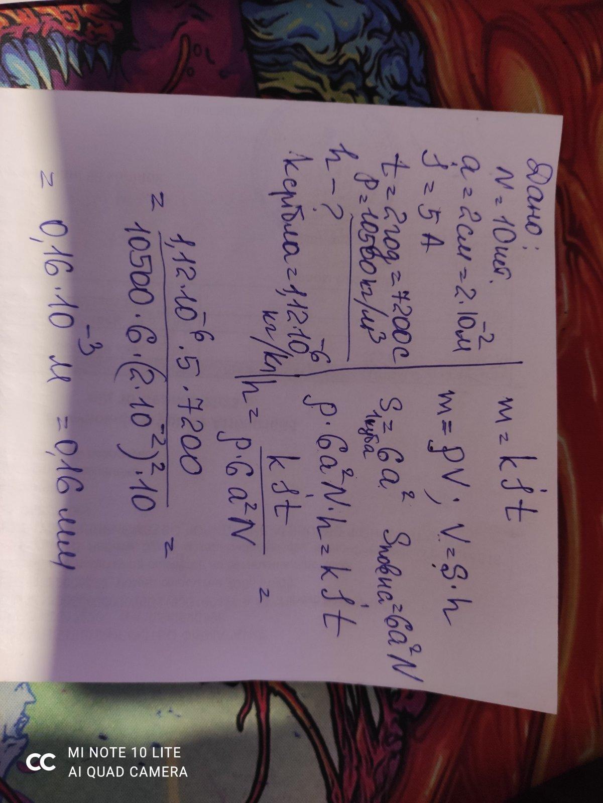 Для сріблення 10 металевих кубів з ребром 2 см струм 5 А пропускали протягом 2 год. Визначте товщину шару срібла, якщо його густина 10500 кг/куб.м