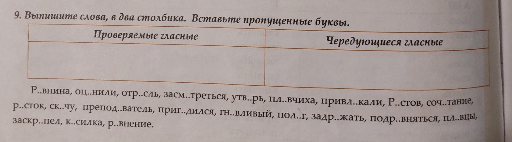 9. Выпишите слова, в два столбика. Вставьте пропущенные буквы. Проверяемые гласные Чередующиеся гла Р..внина, оц..нили, отр..сль, засм..треться, утв..рь, пл..вчиха, привл..кали, Р..сТО р..сток, ск..чу, препод..ватель, приг..дился, гн..вливый, пол..г, задр..жать, подр..вня заскр..пел, к..силка, р..внение.