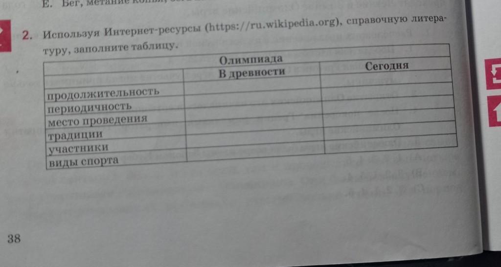 Олимпиада в древности-продолжительность 5 дней//сегодня-16 дней. Периодичность в древности-1 раз в 4 года//сегодня-2 года. Место проведения в древности-Древняя Греция,город Олимп//сегодня-Пекин в 2022 году. Традиции в древности-жертвоприношение кабана Зевсу// сегодня - олимпийское перемирие,обмен значками,сувениры. Участники в древности-свободные греки не совершавшие преступления,взрослые мужчины,юноши не достигшие 20 лет// сегодня- спортсмены,спортсменки. Виды спорта в древности-бегуны,метание диска копья,прыжки в длину,борьба,кулачный бой,пентатлон//сегодня-горные лыжи,биатлон,бобслей,хоккей,санный спорт,фигурное катание.
