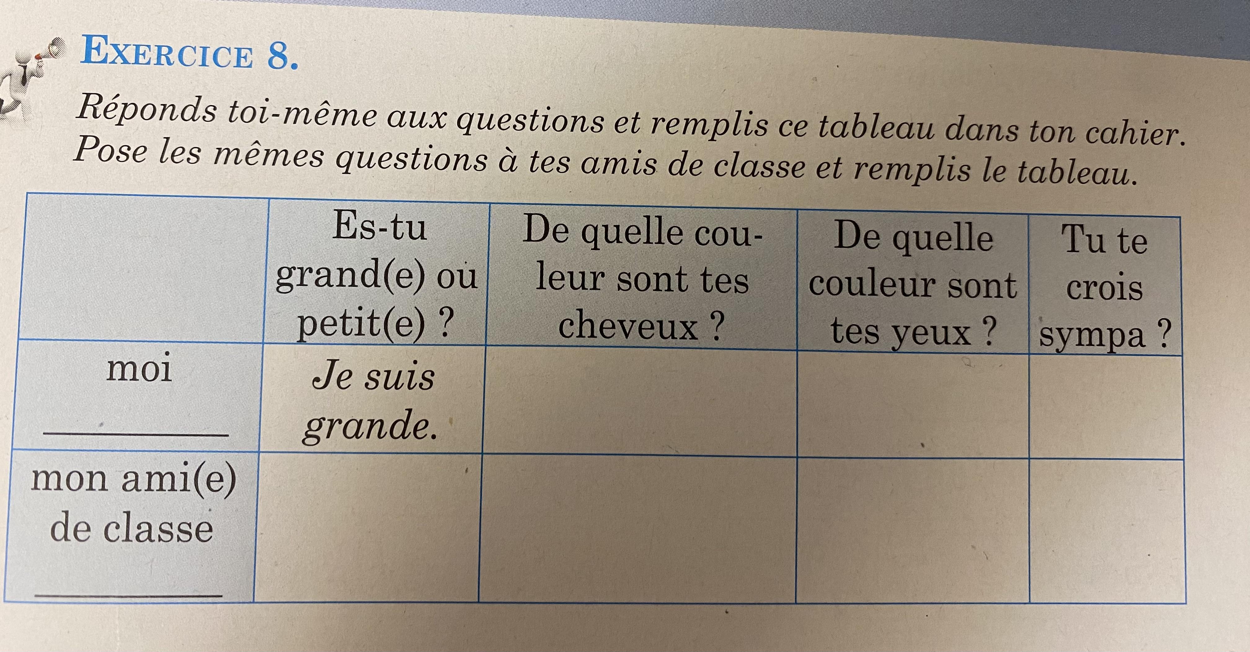 mon amie de classe est la même taille que moi; ses cheveux sont noir; ses yeux sont verte foncé; elle est pas sympa