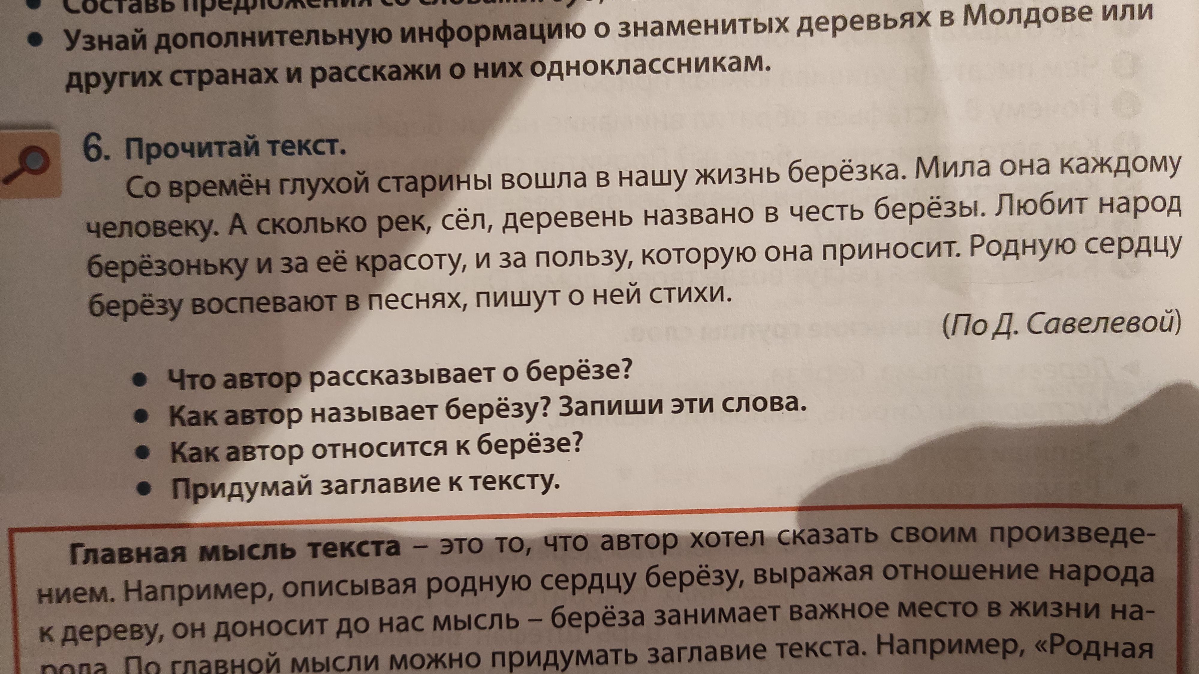 1. Автор говорит, что берёзу очень любит народ. О белом дереве воспевают песни, слагают стихи, называют реки и сёлы.