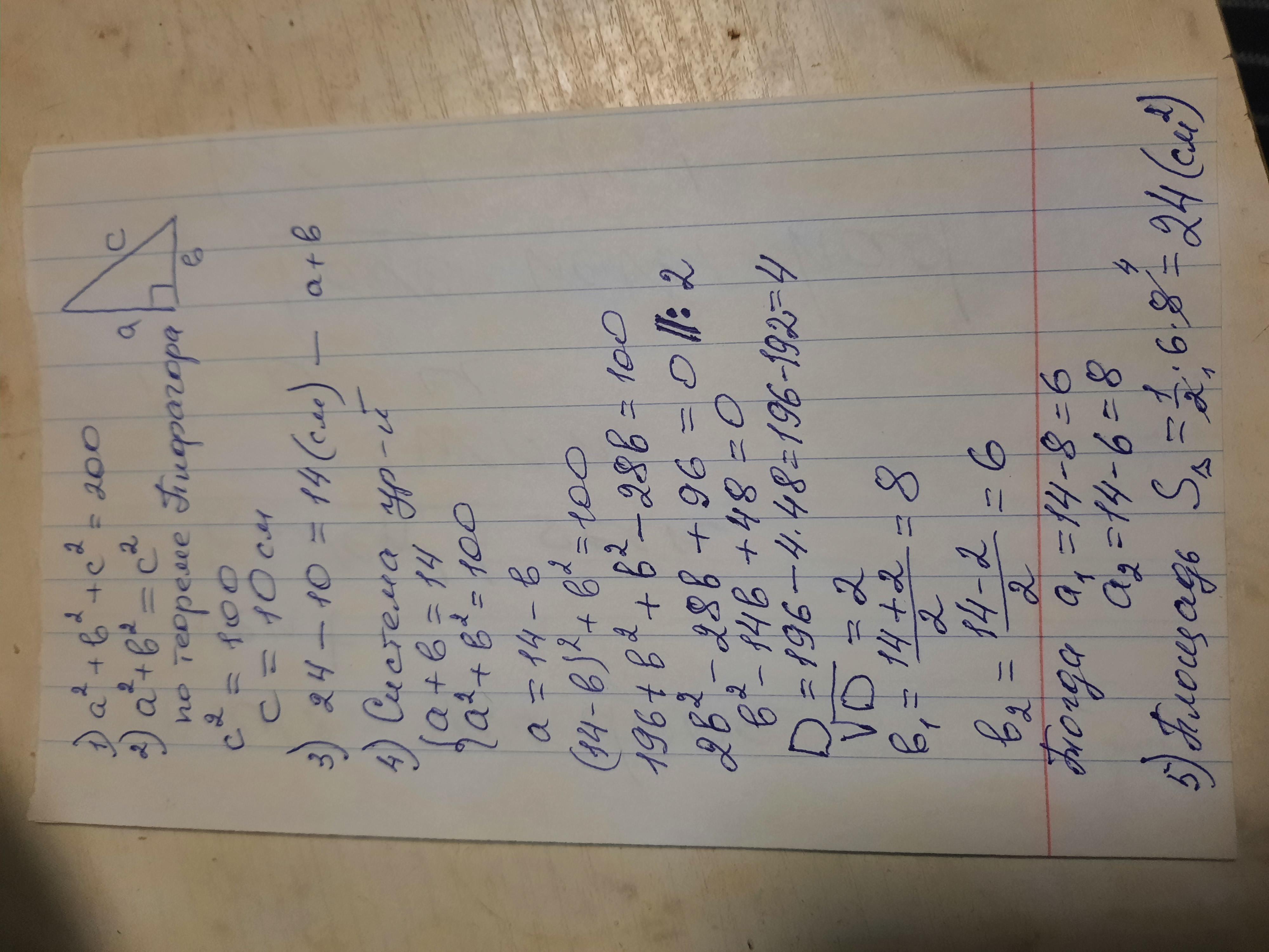Периметр прямоугольного треугольника равен 24 см, а сумма квадратов его сторон равна 200 см². Найти площадь треугольника