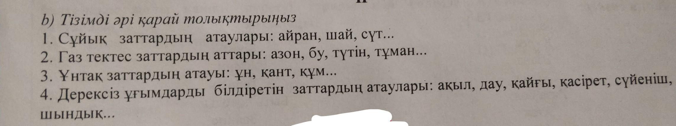 b) Тiзiмдi әрi қарай толықтырыңыз