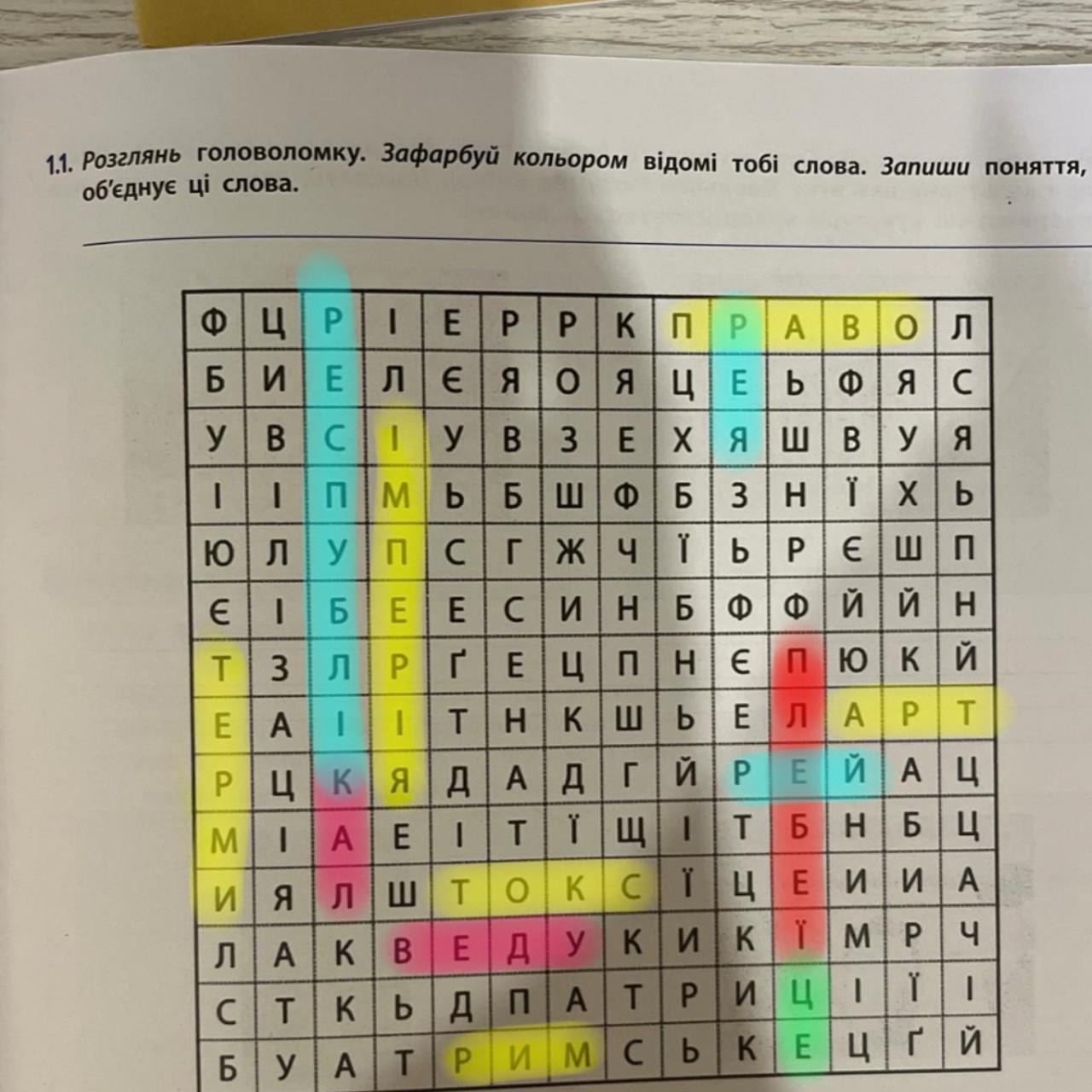 1.1. Розглянь головоломку. Зафарбуй кольором відомі тобі слова. Запиши поняття, яке
