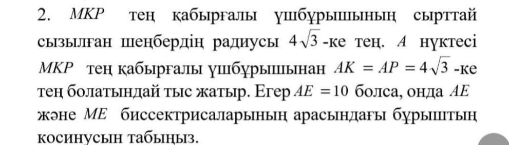 2. Внешний вид равнобедренного треугольника МКР. радиус нарисованной окружности равен 4√3. Точка А От равностороннего треугольника MKR к AK = AP = 4√3 . Если AE =10, то AE и МЕ найдите косинус между биссектрисы