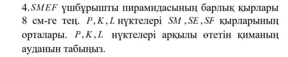 4. Все стороны треугольной пирамиды СМЕФ. равен 8 см. Точки P,K,L являются сторонами SMSE,SF. среды. сечения, проходящего через точки P,K,L найди площадь.