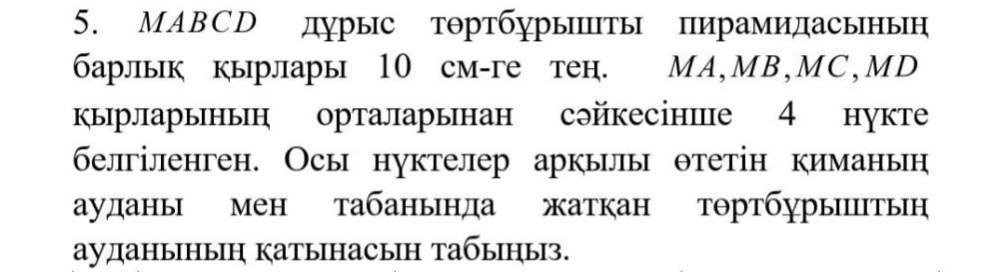 5. MABCD — правильная квадратная пирамида. все стороны равны 10 см. Массачусетс, MB, MC, MD 4 балла соответственно от центров краев учредил. Разрез по этим точкам площадь и найди площадь прямоугольника