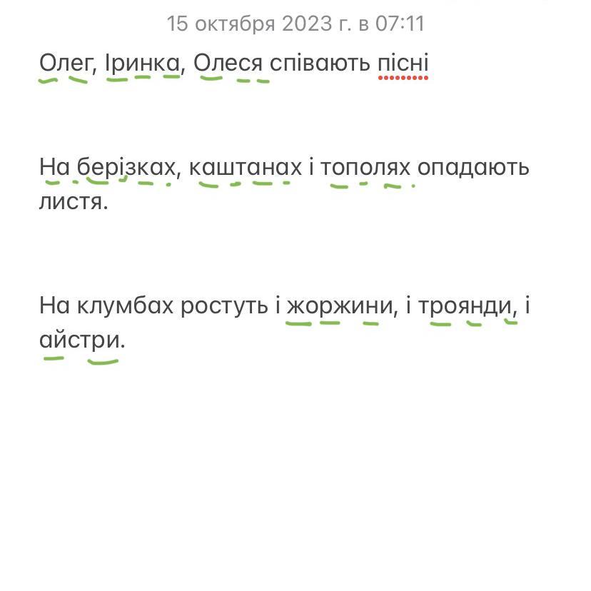 05:14 0 09 - Домашнє завдання вправа 1 Запиши речення та підкресли однорідні члени речення Олег, Іринка, Олеся співають пiснi. На берізках, каштанах і тополях опадають листя. На клумбах ростуть і жоржини, і троянди, i айстри. Прикрепленные файлы (
