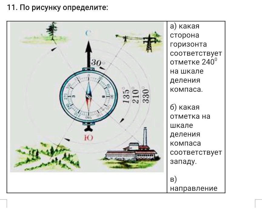 11. По рисунку определите: Sat Ю 30 7/ 135 210° 330 а) какая сторона горизонта соответствует Отметке 240° на шкале деления компаса. б) какая Отметка на шкале деления компаса соответствует западу. в) направление на одиночное дерево