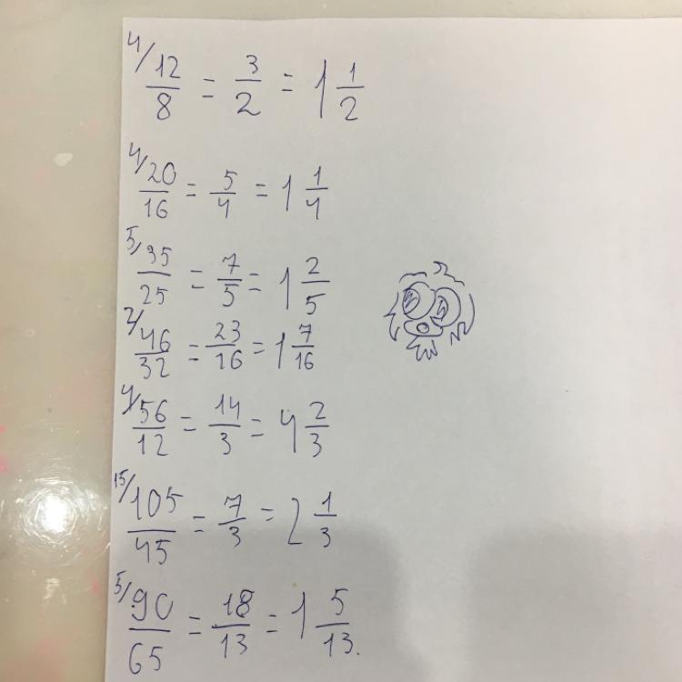 Запишите неправильные дроби в виде смешанного числа,предварительно сократив их: 12/8; 20/16; 35/25; 46/32; 56/12; 105/45; 90/65. В тетради помогите пожалуйста
