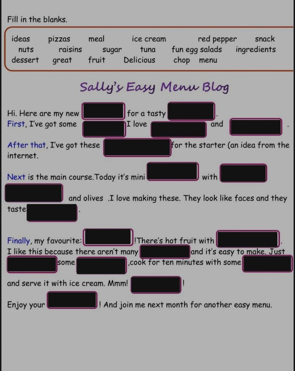 Hi. Here are my new ideas. First, I've got some delicious pizzas and fun egg salads for the starter (an idea from the internet). After that, I've got these mini tuna snacks with red pepper and olives. I love making these. They look like faces and they taste great. Finally, my favourite: hot fruit dessert. I like this because there aren't many ingredients. There's hot fruit with nuts and raisins, and it's easy to make. Just chop the fruit, cook for ten minutes with some sugar and serve it with ice cream. Mmm! Enjoy your meal! And join me next month for another Sally's Easy Menu Blog.