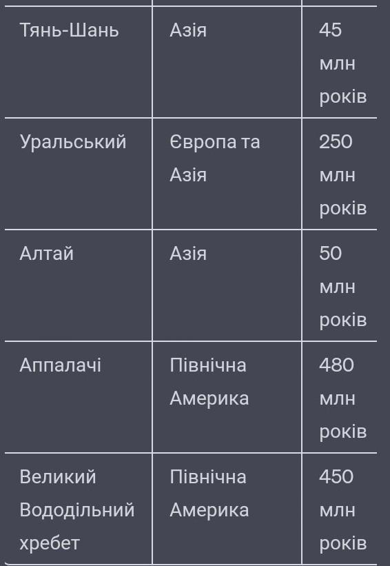 По карті» Будова земної кори " встановіть, коли виникли гори. Сформулюйте, як будете виконувати завдання. Оформіть результати завдання у вигляді таблиці.