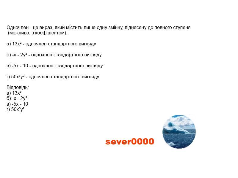 2. Назвіть одночлен стандартного вигляду а) 13xx²; б) -x - 2y²; в) -5x - 10; г) 50х³у².