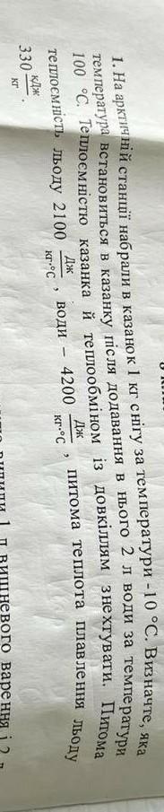 1. На арктичні й станції набрали в казанок 1 кг снігу за температури -10 °С. Визначте, яка температура встановиться в казанку псля додавання в нього 2 л води за температури 100 °C. Теплоємністю казанка й теплообміном iз довкіллям знехтувати. Питома теплоємність льоду 2100 Дж кг.°С питома теплота плавлення льоду 4200 води кДж Kr 330 3 - Дж кг-°С >