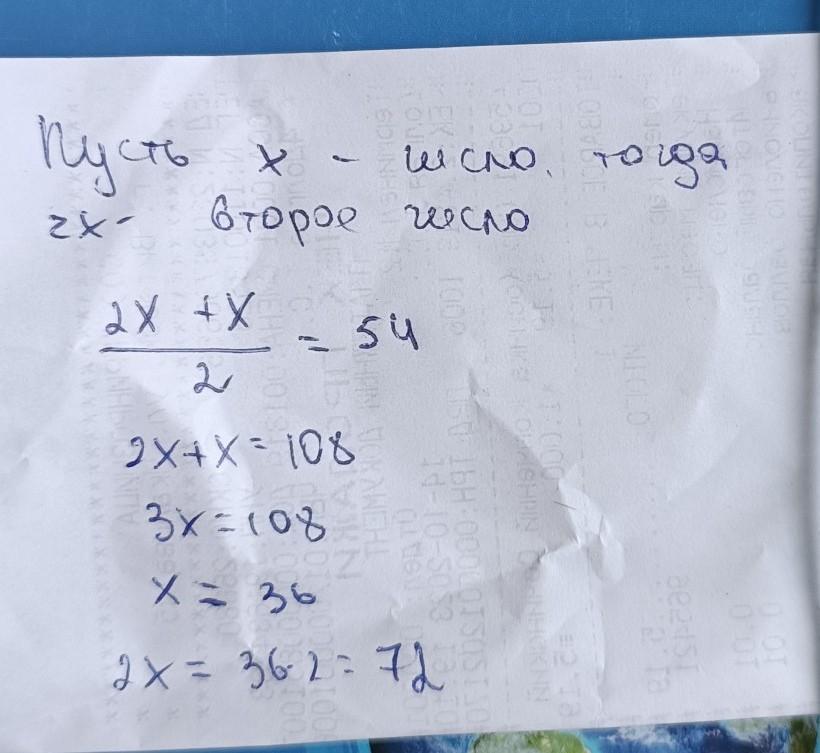 Среднее арифметическое двух чисел равно 54. Одно число в 2 раза больше другого. Найдите эти числа.