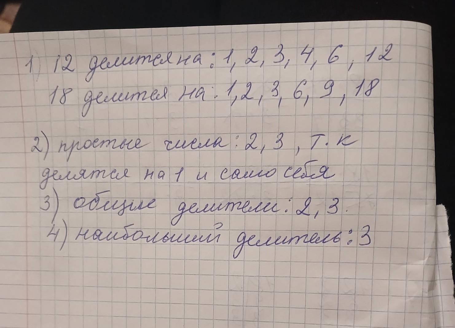 284. Даны числа 12 и 18. 1) Найдите делители каждого числа. 2) Укажите делители, которые являются простыми числами. 3) Назовите общие делители данных чисел. 4) Укажите среди общих делителей наибольший общий делитель. mg*Помогите дам 100 балов