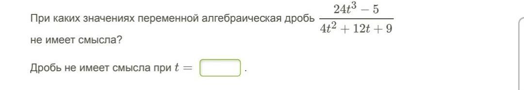 При каких значениях переменной алгебраическая дробь не имеет смысла? 24t³ - 5/ 4t² + 12t + 9