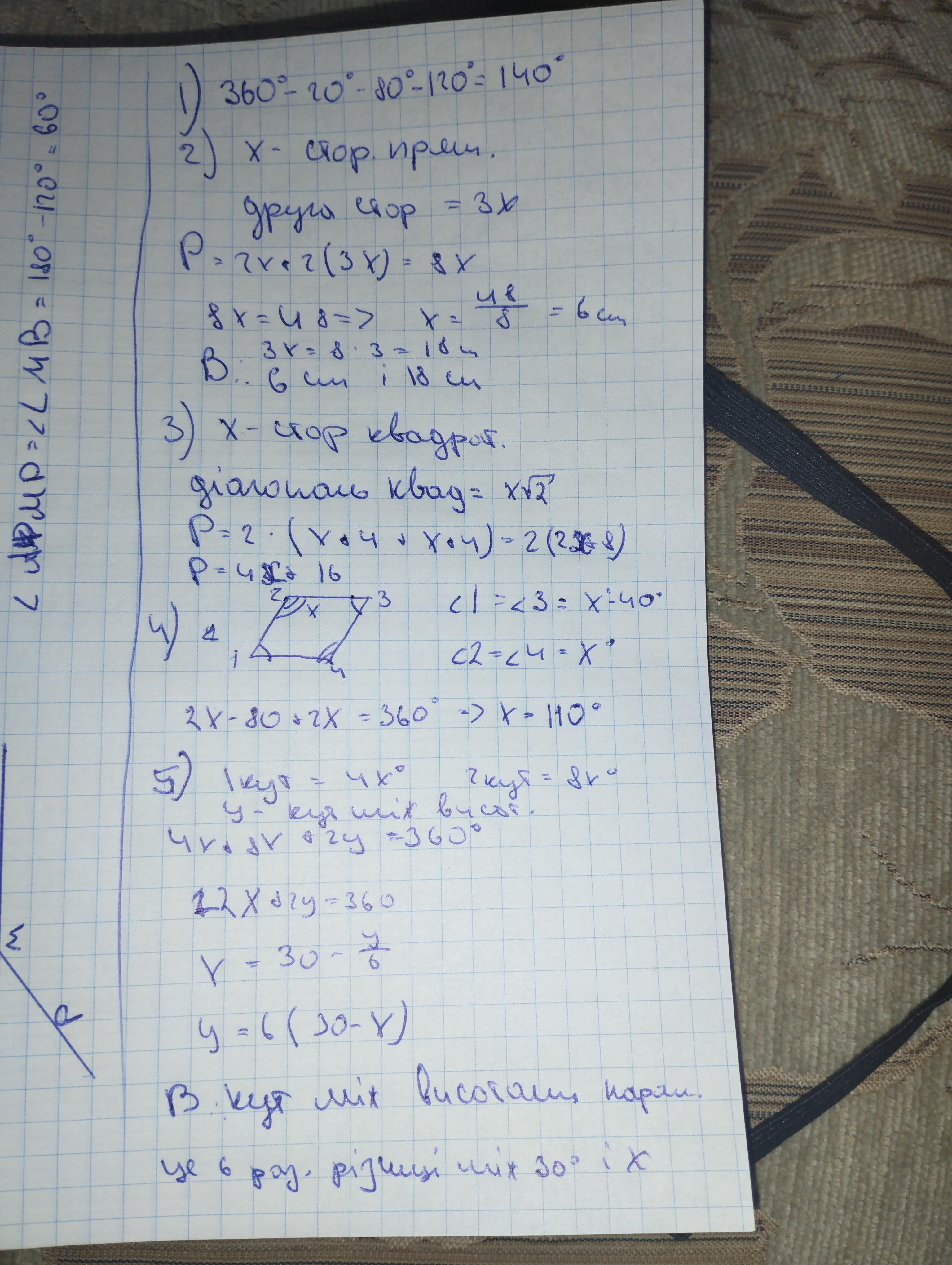1) 26 Знайдіть четвертий кут чотирикутника, якщо три з них 20°,80°,120° 2) 36 Периметр прямокутника дорівнює 48 см, а одна з його сторін в 3 рази більше від іншої. Знайдіть сторони прямокутника. 3) 26 Точка перетину діагоналей знаходиться на відстані 4см від його сторін. Знайдіть периметр квадрата. 4) 26 Один із кутів ромба на 40° менший за другий. Знайдіть кути ромба. 5) 36 Два кути паралелограма відносяться як 4:8. Знайдіть кут між висотами паралелограма, проведеними з вершини тупого кута,срочно помогите пожалуйста