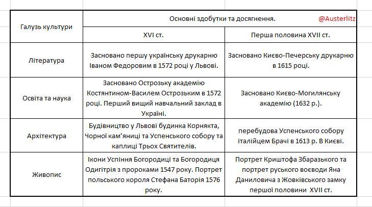 Заповнена таблиця "Розвиток культури України в XVI - першій половині XVII ст." подана нижче на фото.
