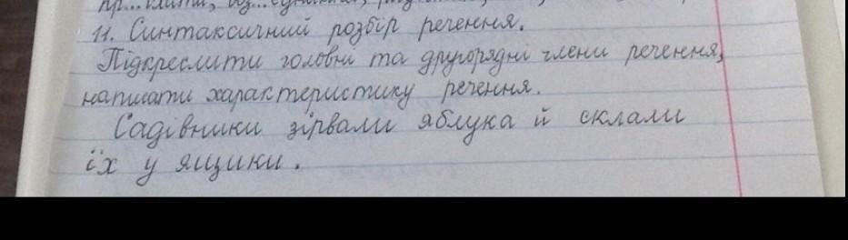 Підмети: Садівники, яблука, присудки: зірвали, склали.