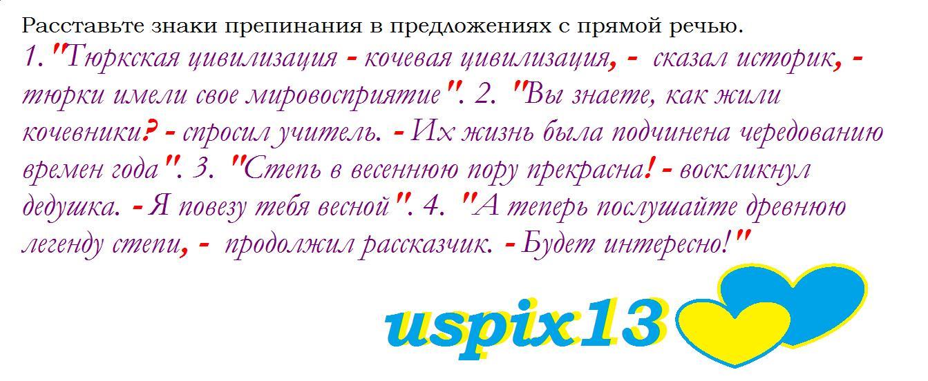 Расставьте знаки препинания в предложениях с прямой речью. кочевая цивилизация сказал историк тюрки 1.Тюркская цивилизация имели свое мировосприятие. 2. Вы знаете, как жили кочевники спросил учи- тель. Их жизнь была подчинена чередованию времен года. 3. Степь в весеннюю пору прекрасна воскликнул дедушка. Я повезу тебя весной. 4. А теперь послу- шайте древнюю легенду степи продолжил рассказчик. Будет интересно! пжж