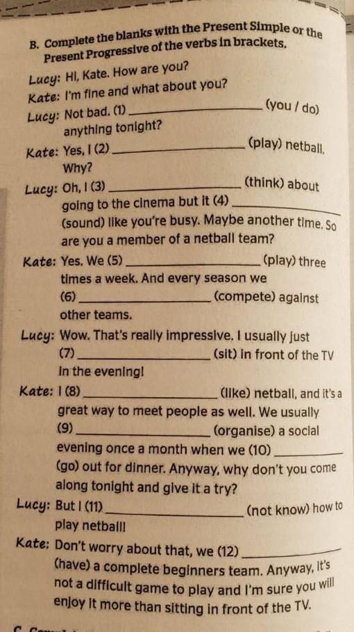 Lucy: Oh, I'm thinking about going to the cinema, but it sounds like you're busy. Maybe another time. So, are you a member of a netball team?