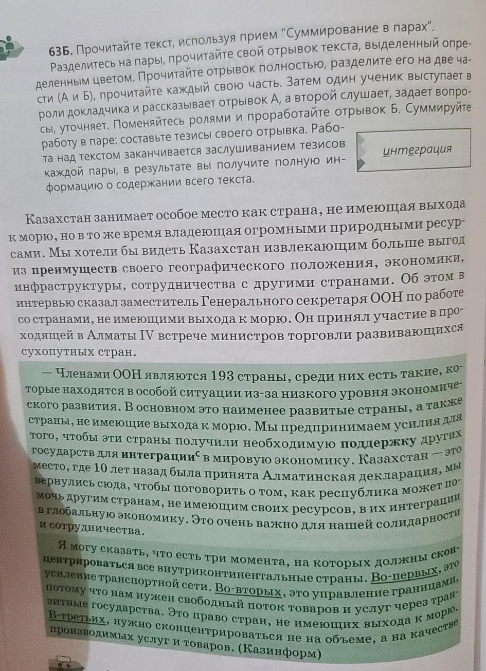 63Б. Прочитайте текст, используя прием "Суммирование в парах". Разделитесь на пары, прочитайте свой отрывок текста, выделенный опре- деленным цветом. Прочитайте отрывок полностью, разделите его на две ча- сти (А и Б), прочитайте каждый свою часть. Затем один ученик выступает в роли докладчика и рассказывает отрывок А, а второй слушает, задает вопро- сы, уточняет. Поменяйтесь ролями и проработайте отрывок Б. Суммируйте работу в паре: составьте тезисы своего отрывка. Рабо- та над текстом заканчивается заслушиванием тезисов каждой пары, в результате вы получите полную ин- формацию о содержании всего текста. интеграция Казахстан занимает особое место как страна, не имеющая выхода к морю, но в то же время владеющая огромными природными ресур- сами. Мы хотели бы видеть Казахстан извлекающим больше выгод из преимуществ своего географического положения, экономики, инфраструктуры, сотрудничества с другими странами. Об этом в интервью сказал заместитель Генерального секретаря ООН по работе со странами, не имеющими выхода к морю. Он принял участие в про- ходящей в Алматы IV встрече министров торговли развивающихся сухопутных стран. - - Членами ООН являются 193 страны, среди них есть такие, ко- торые находятся в особой ситуации из-за низкого уровня экономиче- ского развития. В основном это наименее развитые страны, а также страны, не имеющие выхода к морю. Мы предпринимаем УСИЛИЯ ДЛЯ того, чтобы эти страны получили необходимую поддержку других государств для интеграции в мировую экономику. Казахстан место, где 10 лет назад была принята Алматинская декларация, мы вернулись сюда, чтобы поговорить о том, как республика может по- мочь другим странам, не имеющим своих ресурсов, в их интеграции в глобальную экономику. Это очень важно для нашей солидарности - это и сотрудничества. Я могу сказать, что есть три момента, на которых должны скон- центрироваться все внутриконтинентальные страны. Во-первых, это усиление транспортной сети. Во-вторых, это управление границами, потому что нам нужен свободный поток товаров и услуг через тран зитные государства. Это право стран, не имеющих выхода к морю В-третьих, нужно сконцентрироваться не на объеме, а на качестве производимых услуг и товаров. (Казинформ) СРОЧНО!!! ДАЮ 25 БАЛЛОВ