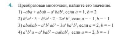 переобразовав многочлен найдите его значение. 1)-аба+абаб-абаб', где a=1,b=2 2) ba 5-ba³¹· 2-2a b', где a = − 1, b = −1 3) ababab-a bab³-za ba b', где a=2, b=-1 4) аба-абаб2 - аабаб³, где а=-2, б=-1