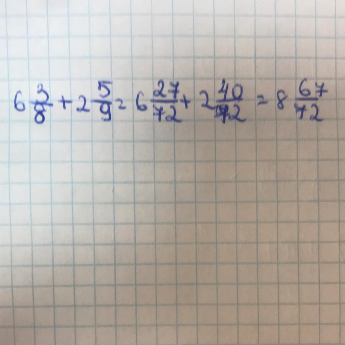 6 * 3/8 + 2 * 5/9 = (6 * 3 * 9)/(8 * 9) + (2 * 5 * 8)/(9 * 8) = (162 + 80)/72 = 242/72 = 3 11/72