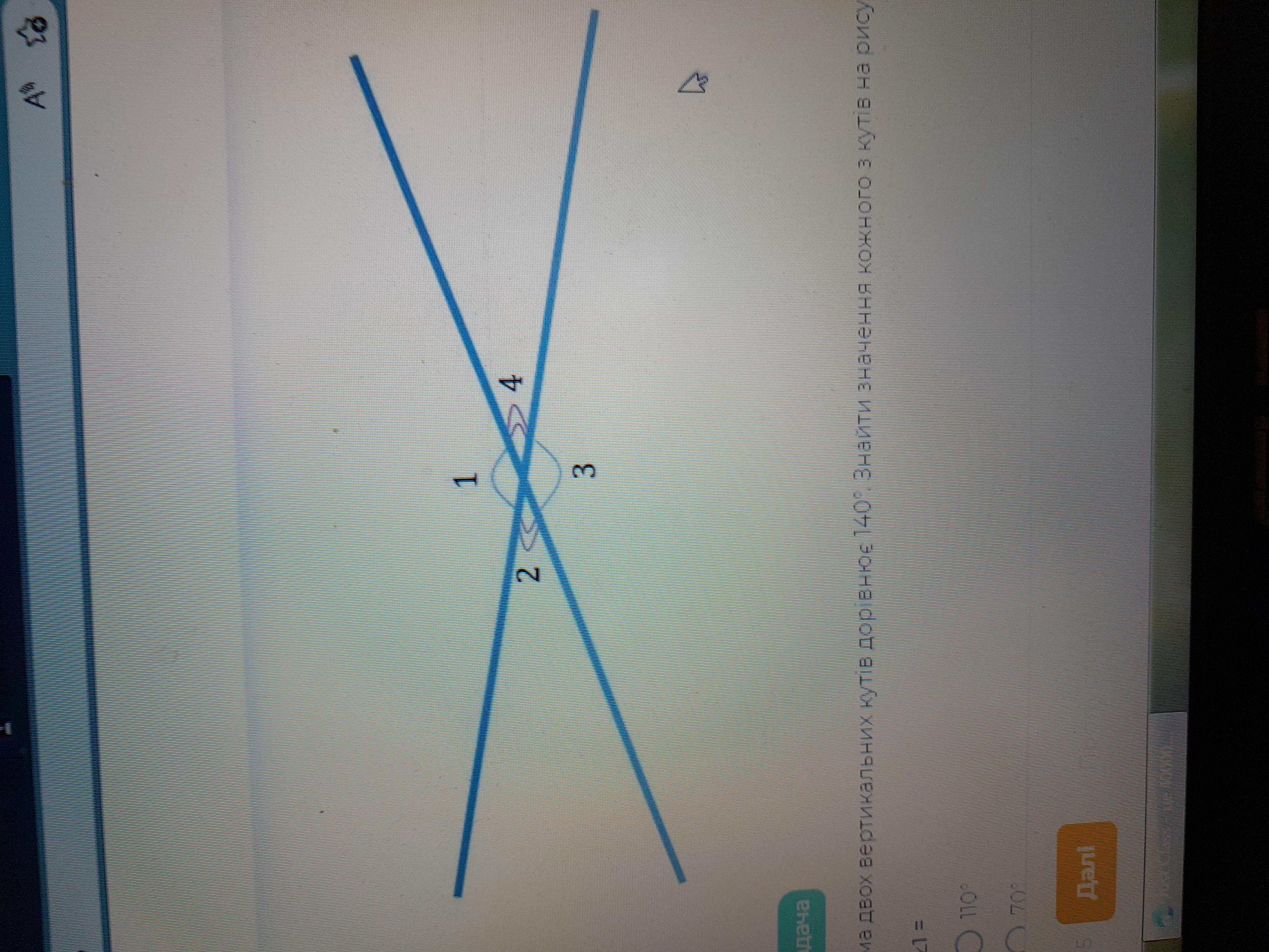 вертикальные углы равны,поэтому если их сумма равна 140 градусов,то тогда каждый из них равен 140°:2=70°(это острый угол,поэтому это ∠2 и ∠4)