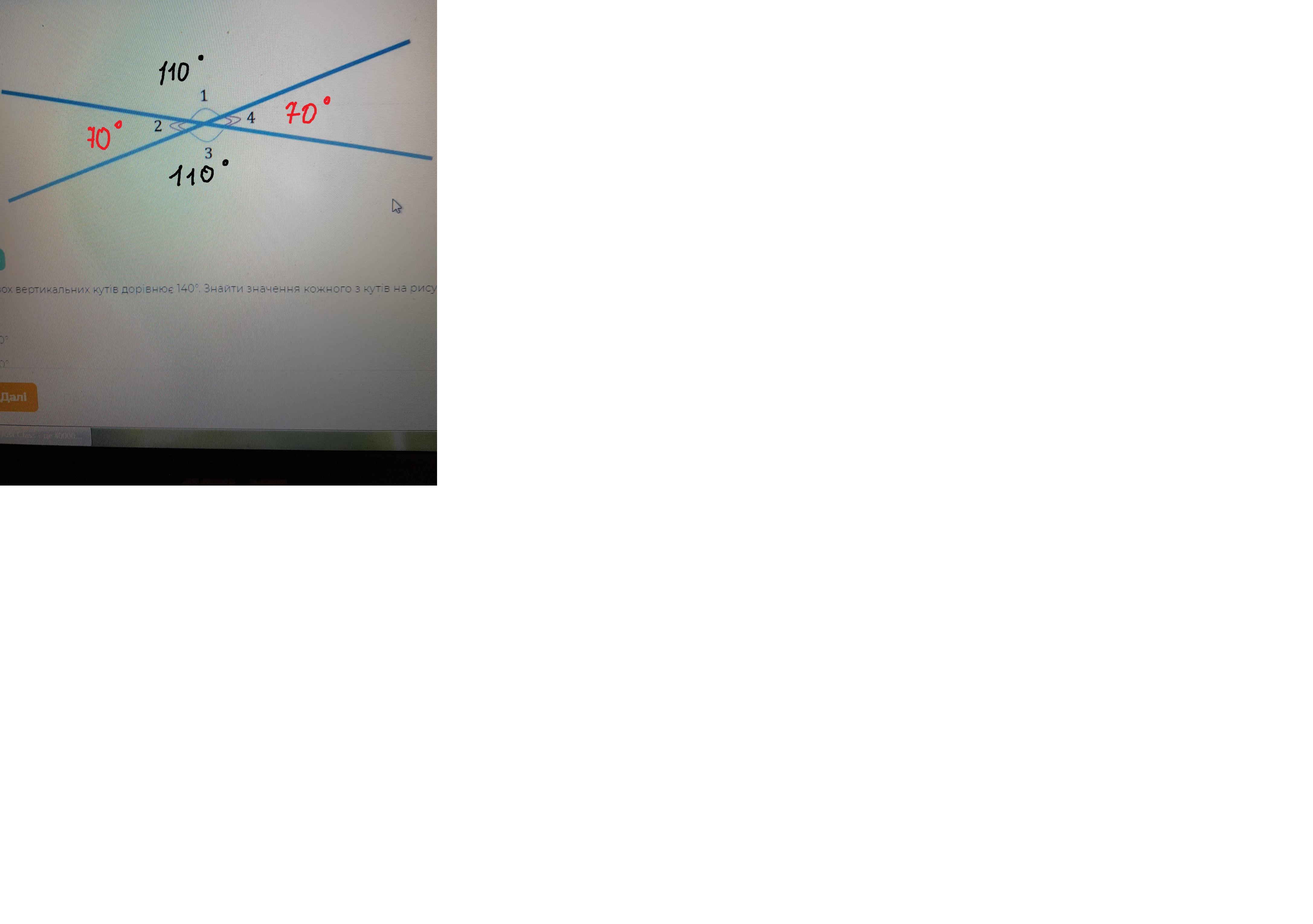 Сума двох вертикальних кутів дорівнює 140°. Знайти кожного з кутів на рисунку.