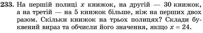 Вираз для цього можна записати так: 30 + х (книжок на другій полиці) + х (книжок на першій полиці) + 5.
