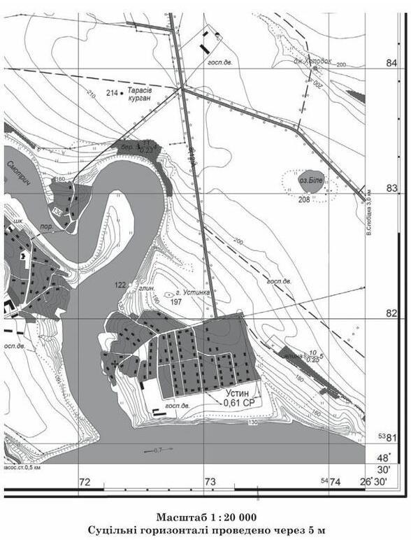 1. Визначте географічні координати та квадрат в якому розташована гора Устинка.