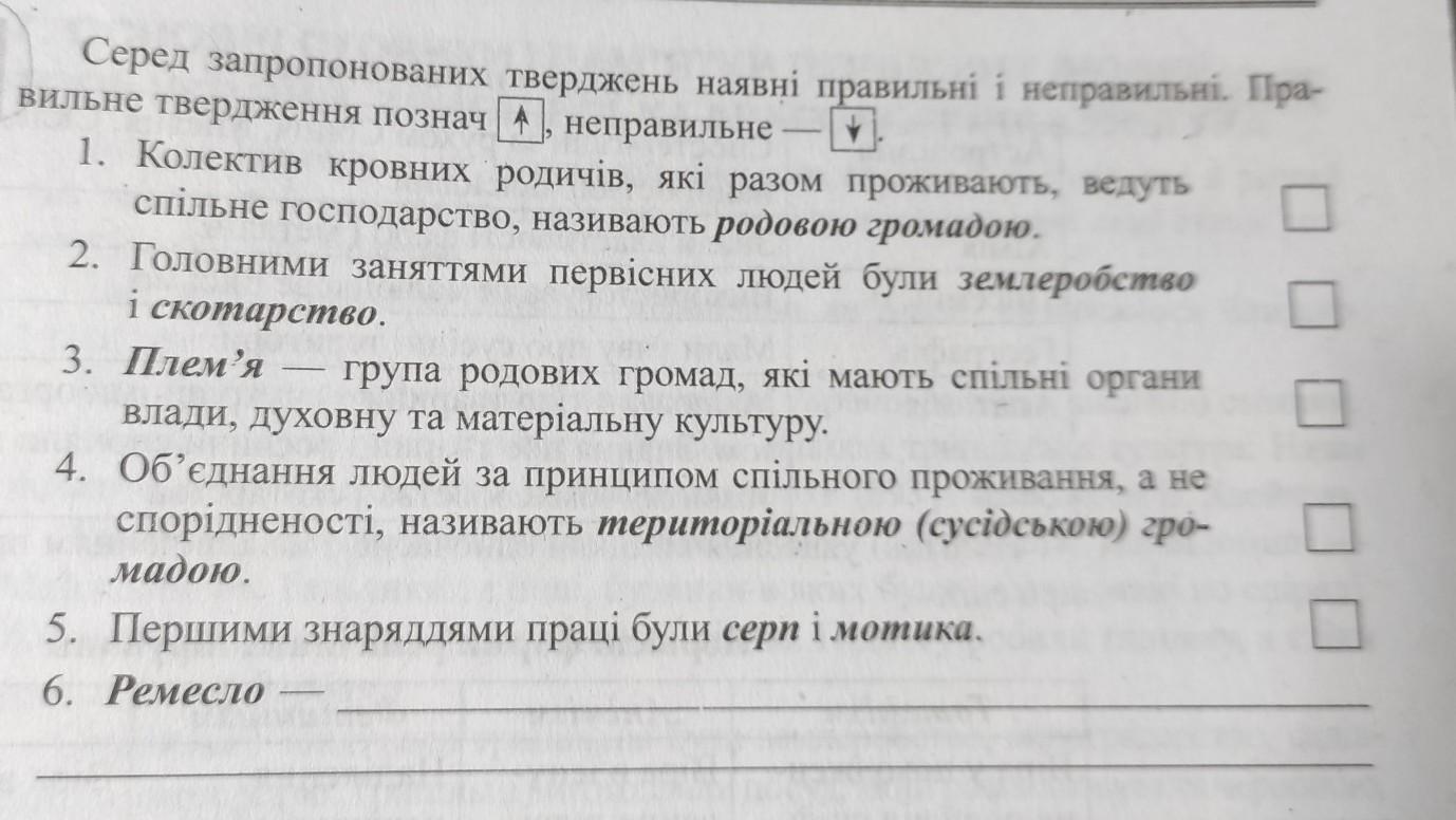 Серед запропонованих тверджень наявні правильні і неправильні. Пра- вильне твердження познач[4, неправильне M 1. Колектив кровних родичів, які разом проживають, ведуть спільне господарство, називають родовою громадою. 2. Головними заняттями первісних людей були землеробство i скотарство. 3. Плем'я група родових громад, які мають спільні органи влади, духовну та матеріальну культуру. 4. Об'єднання людей за принципом спільного проживання, а не спорідненості, називають територіальною (сусідською) гро- - - мадою. 5. Першими знаряддями праці були серп і мотика. 6. Ремесло --
