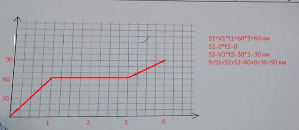 Автомобиль ехал 1 ч со скоростью 60 км/ч,затем 2 ч стоял ,а потом ехал ещё 1 ч со скоростью 30 км/ч.Посторойте график зависимости пройденного от пути времени.