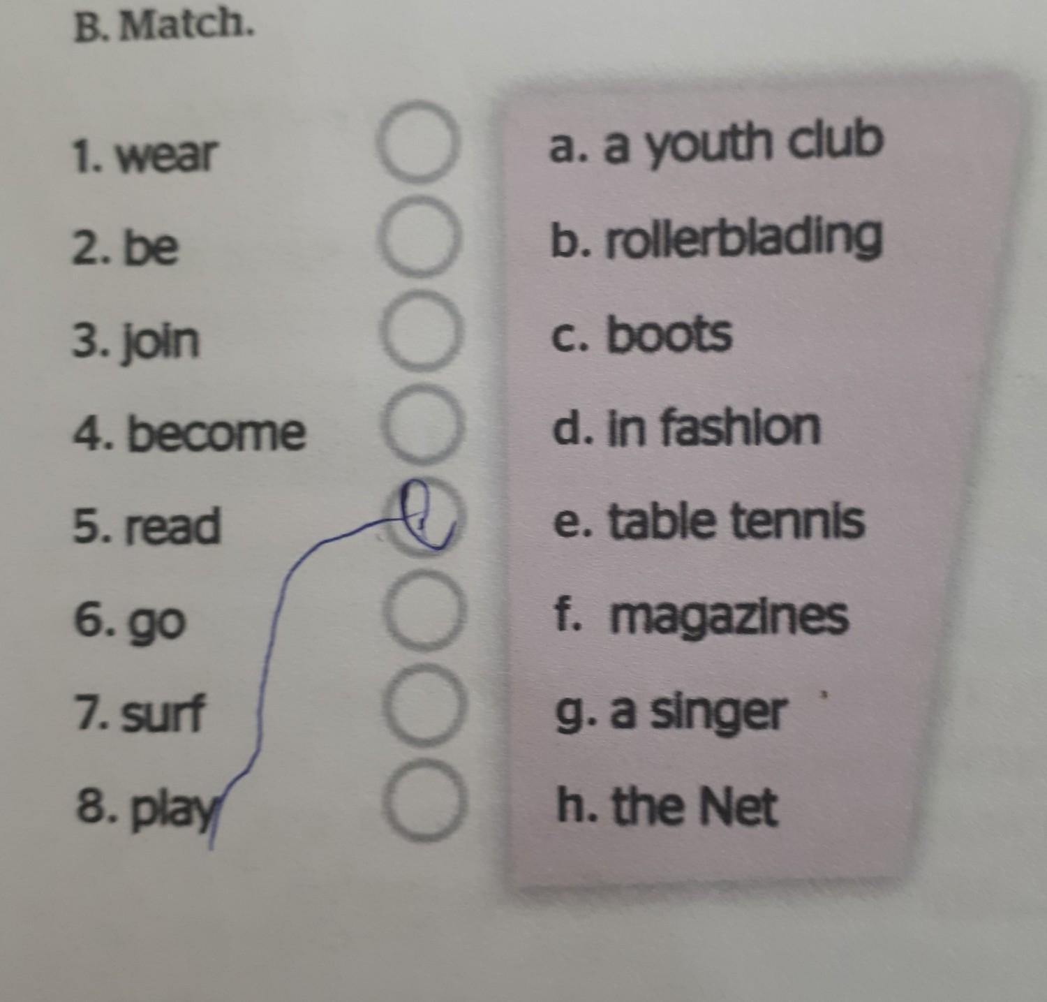 B. Match. 1. wear 2. be 3. Join 4. become 5. read 6.90 7. surf 8. play 00000000 a. a youth club b. rollerblading c. boots e table tennis f. magazines g. a singer h. the Net