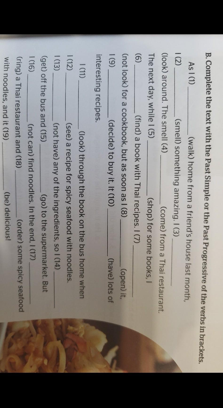 B. Complete the text with the Past Simple or the Past Progressive of the verbs in brackets. (walk) home from a friend's house last month, As I (1) (smell) something amazing. I (3) 1 (2) (look) around. The smell (4) The next day, while I (5) (6) (find) a book with Thai recipes. I (7) (come) from a Thai restaurant. (shop) for some books, I (not look) for a cookbook, but as soon as I (8) 1 (9) (decide) to buy it. It (10) interesting recipes. I (11) 1 (12) I (13) (get) off the bus and (15) I (16) (ring) a Thai restaurant and (18) with noodles, and it (19) (look) through the book on the bus home when (see) a recipe for spicy seafood with noodles. (not have) any of the ingredients, so I (14) (open) it, (have) lots of (go) to the supermarket. But (not can) find noodles. In the end, I (17) (order) some spicy seafood (be) delicious!