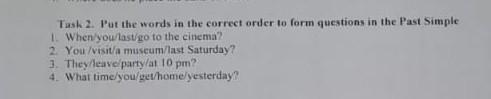 Task 2. Put the words in the correct order to form questions in the Past Simple 1. When/you/last/go to the cinema? 2. You /visit/a museum/last Saturday? 3. They/leave/party/at 10 pm? 4. What time/you/get/home/yesterday?