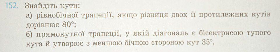 а) Для рівнобічної трапеції, де різниця двох її протилежних кутів дорівнює 80°, ми можемо використати наступний підхід: