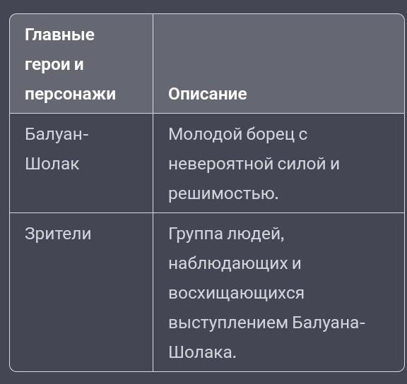 Основная мысль: В истории Балуана-Шолака подчеркивается его невероятная сила, решимость и вера в себя, что позволяют ему поднимать гири, даже когда другие сомневаются. Его выступление вызывает восхищение зрителей и подчеркивает важность веры в собственные силы.